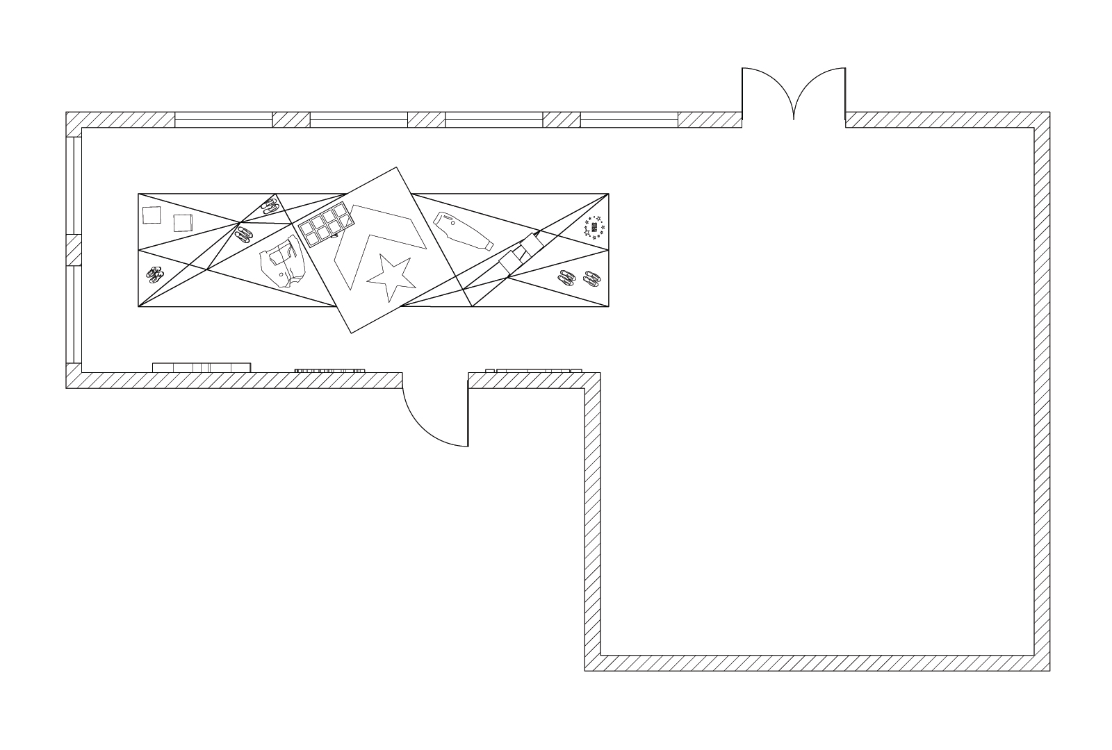 The design aimed to create topographic surfaces where products can be freely positioned. Using the star from the lock-up as a parti, the figure was stretched and projected into triangulated forms. The two massings pulled up from the ground and reached their apex in the middle. The two "stars" bracketed a rotated square in between the two parts. The depression in the center acted as a passageway but also as a shoppable niche lined with mirrors. Some of the triangulated surfaces were composed of CNC-cut redimats, these mats allowed the products to grip on but also referenced a common texture seen in the streets.