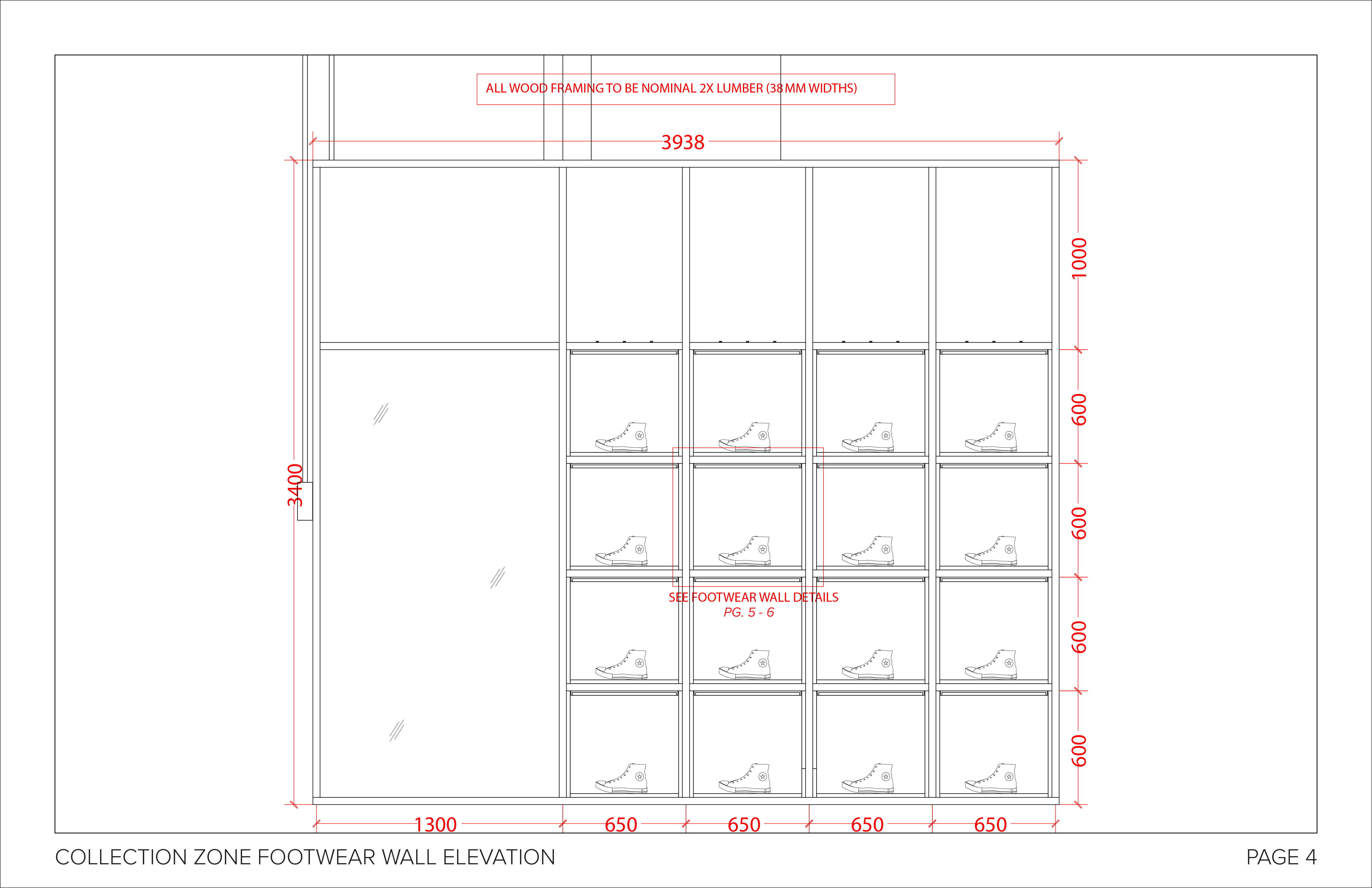 From the scaffold footwear walls to the CMU tables to the two-by frames to the light fixtures, we rolled out a whole new fixture system grounded in authentic materials and construction techniques. The floor space was divided rationally, footwear on the left, apparel on the right, men's upfront, and women's near the back. The space in the center separating the front and back was conceived as an exploded wooden box, a flexible space adapting to seasonal stories. The light fixture capping this space is composed of two layers. The T8 light tubes were blacked out to produce the star chevron logo and the metal plate behind the tubes had embedded LED lights that spelled out the Chinese characters "Beijing". Due to the depth of the light tubes, the characters could only be seen from certain perspectives. The Wukuseong store exemplified Converse's best expression in retail design.